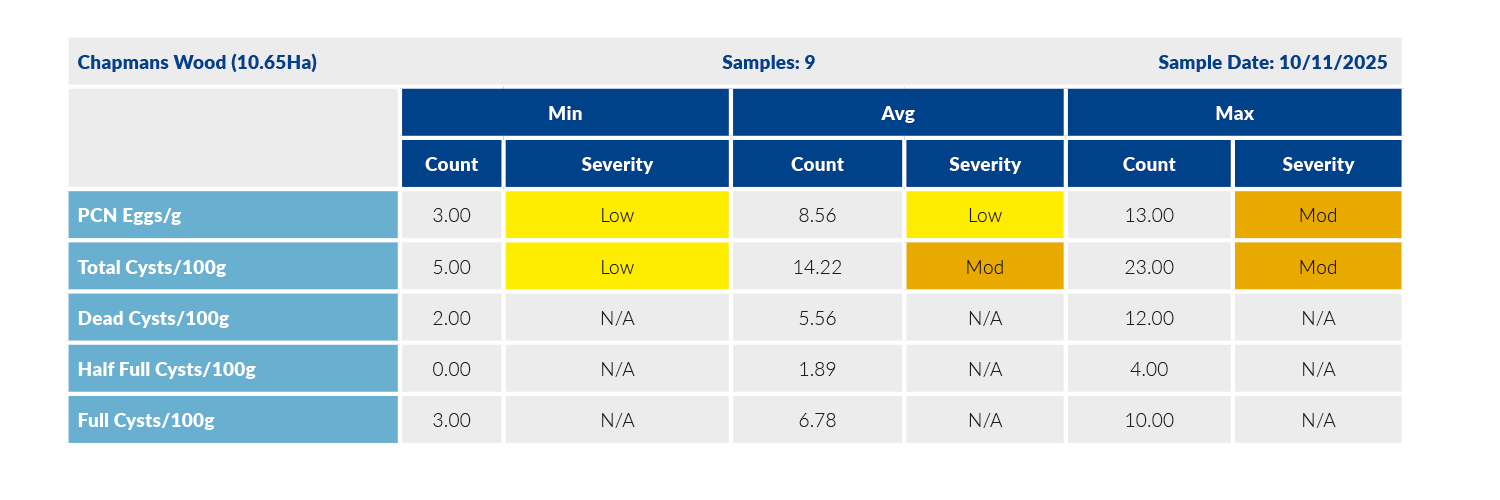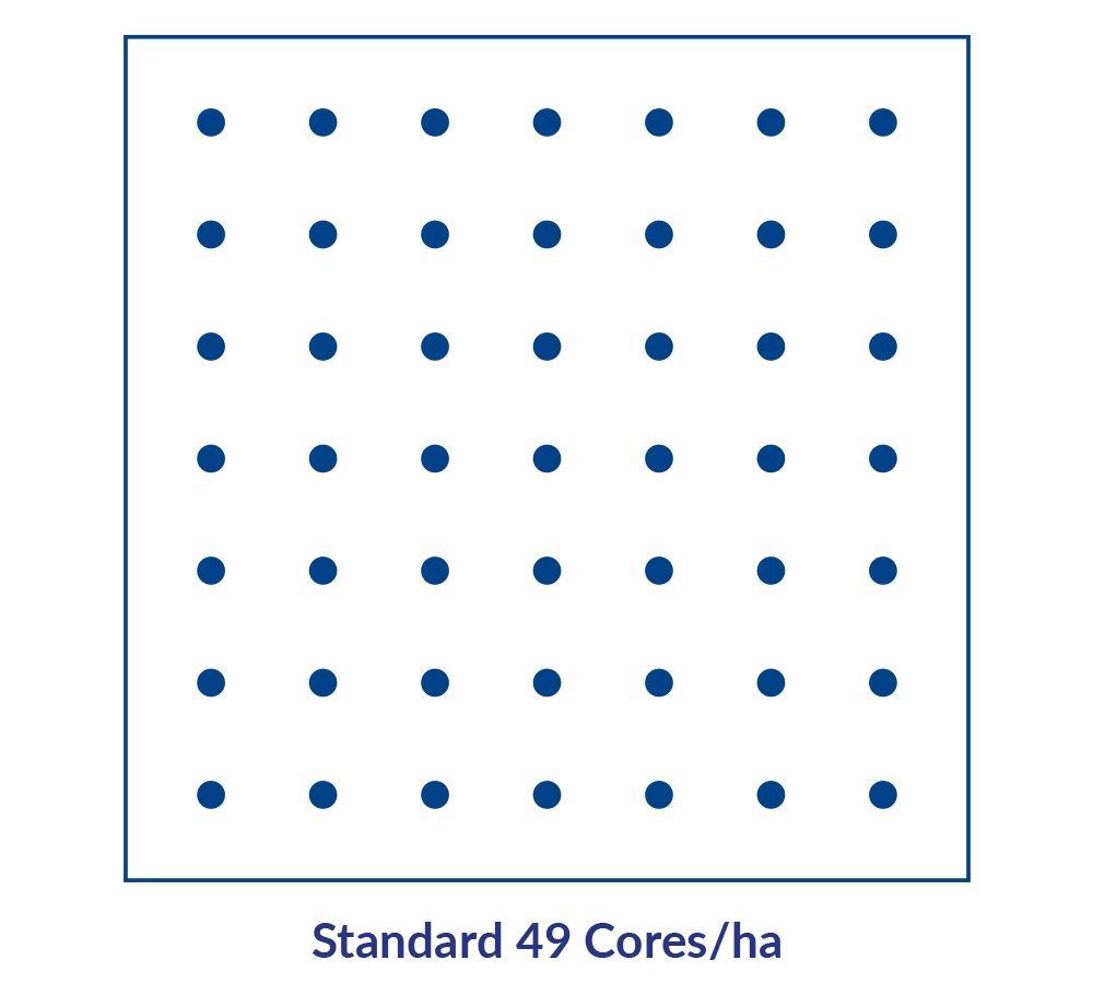 PCN sampling is carried out on a 1 hectare grid map, analysing 200g samples. This is the optimum technique, in line with AHDB guidance. Any other approach is not deemed sufficiently accurate.
