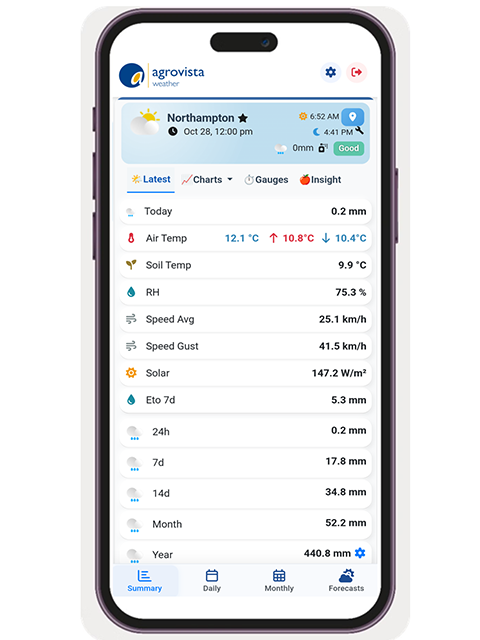 Protect your crops: Get early warnings for disease risk, frost, or poor spray conditions.